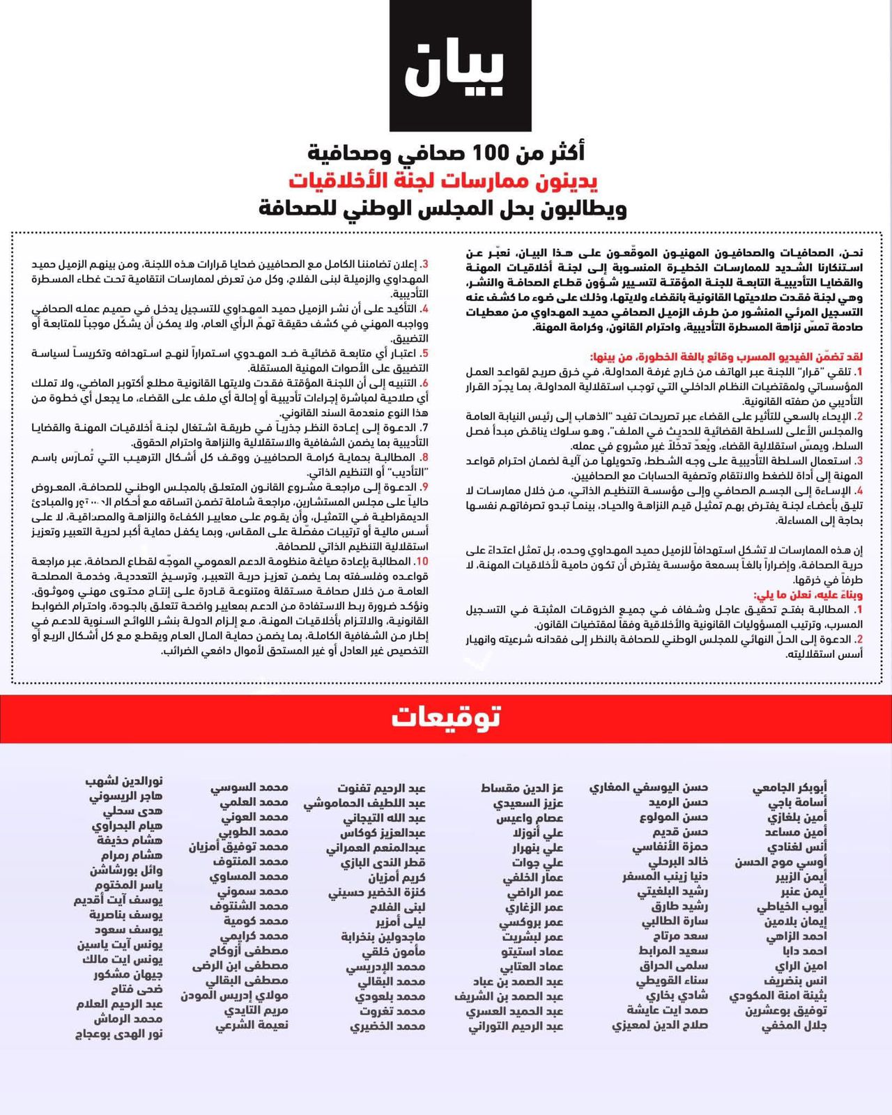 نحن، الصحافيات والصحافيون المهنيون الموقّعون على هذا البيان، نعبّر عن استنكارنا الشديد للممارسات الخطيرة المنسوبة إلى لجنة أخلاقيات المهنة والقضايا التأديبية التابعة للجنة المؤقتة لتسيير شؤون قطاع الصحافة والنشر، وهي لجنة فقدت صلاحيتها القانونية بانقضاء ولايتها، وذلك على ضوء ما كشف عنه التسجيل المرئي المنشور من طرف الزميل الصحافي حميد المهداوي من معطيات صادمة تمسّ نزاهة المسطرة التأديبية، واحترام القانون، وكرامة المهنة.